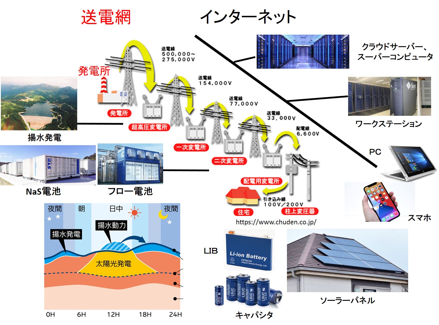 このページに書いてあること 1) 送電網はインターネットと類似している 2) 再生可能エネルギー発電は分散しているので、その出力を 平準化するにはクラウドサーバーにあたる揚水発電ではなく、 スマホやパソコンにあたる分散型蓄電デバイスが必要 |
