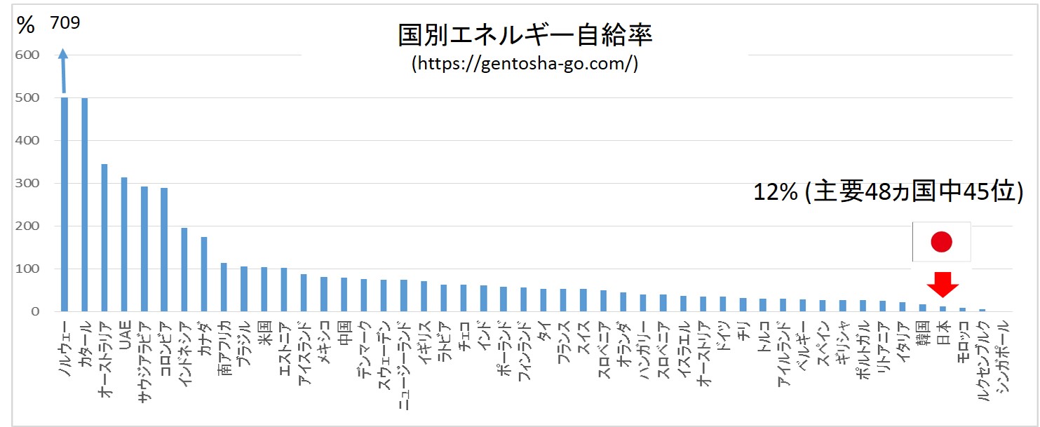 ![]() 図1 国別のエネルギー自給率 (https://gentosha-go.com/articles/) | ||