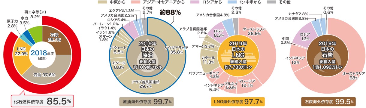![]() 図2 日本の一次エネルギー供給構成および化石燃料輸入先 (https://www.enecho.meti.go.jp/) | ||