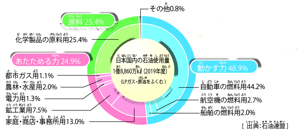 ![]() 図3 日本国内での石油の用途 (https://www.paj.gr.jp/data/ebook/shirabetemiyou2021.pdf) | ||