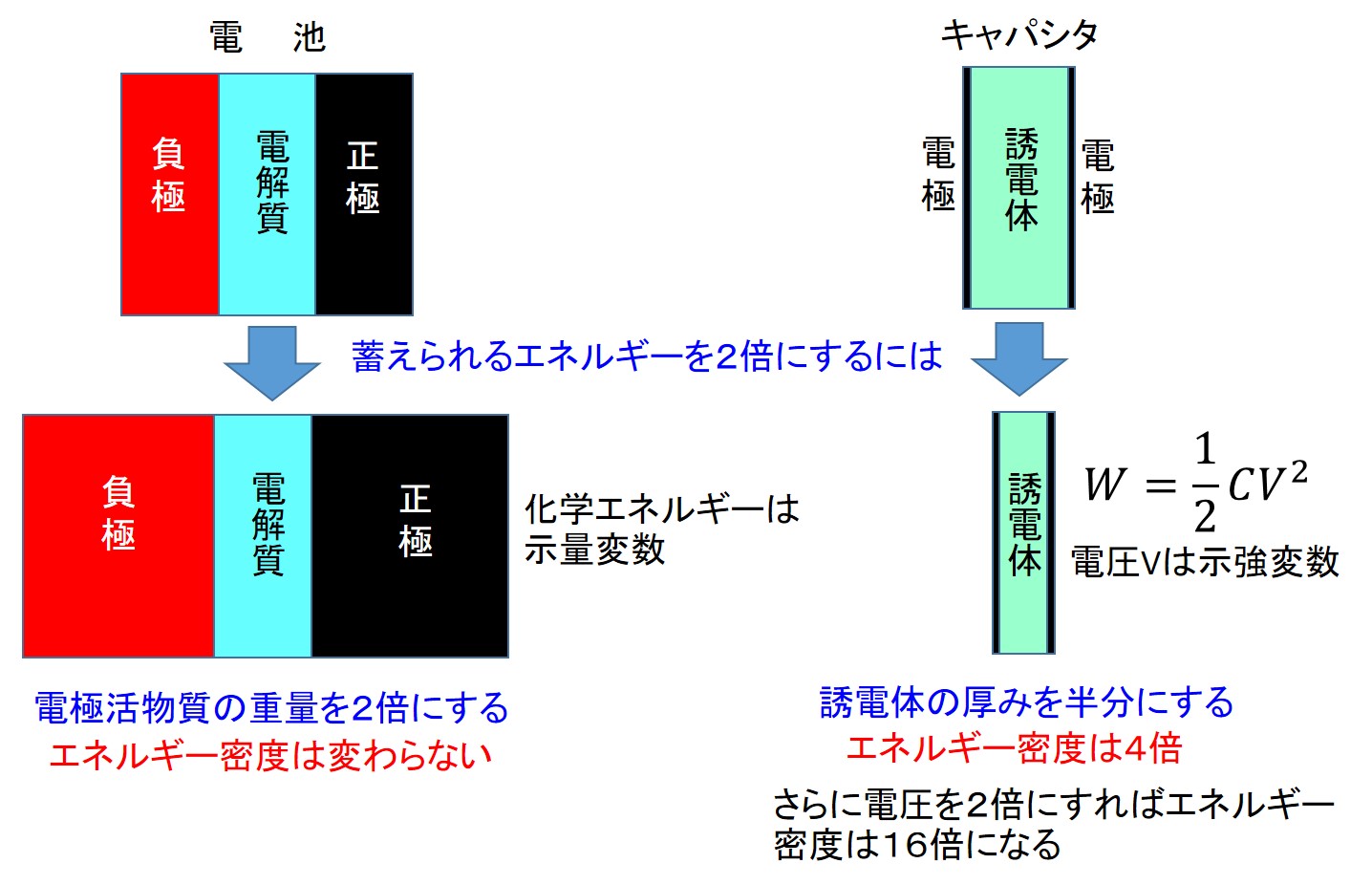 図1に電池とキャパシタのエネルギー密度の違いを示します。 電池は電気エネルギーを化学反応のエネルギー(化学エネルギー)に変換して蓄えますが、化学エネルギーは典型的な示量変数です。 つまり、電池に蓄えられるエネルギーは反応に関与する物質量に比例します。したがって、電池に蓄えられるエネルギーを2倍にしたければ電極活物質の重量を2倍にする必要があります。 しかし、エネルギーは2倍にしても重量が2倍になったのでは、蓄電デバイスの重要な性能指標であるエネルギー密度を上げることはできません。 つまり、電池のエネルギー密度は、化学反応と電極活物質が同じならば一定値となります。 一方、誘電体の厚みを半分にすれば、キャパシタに蓄えられるエネルギーを2倍にすることができます。これは静電容量Cが厚みに反比例するためです。 キャパシタの電極は非常に薄くすることができるので、その重量を無視すれば、誘電体の厚みを半分にすることでキャパシタの重量も半分になるので、エネルギー密度は4倍になります。 さらに電圧は示強変数なので、物質量に関わらず自由に変えることができます。例えば、誘電体の厚みを半分にして、さらに電圧を2倍にすれば、蓄えられるエネルギーはなんと16倍にもなるのです。 電池の研究者に、「あなたの研究している電池のエネルギー密度を16倍にできますか?」と聞いたときに「できる」と答える人は絶対にいません。実際は2倍にすることも非常に困難なのです。 このようにキャパシタのエネルギー密度には理論的な限界が無く、努力次第でいくらでも上げることができます。このことは積層セラミックスキャパシタ開発の歴史で既に証明されています。 | ||