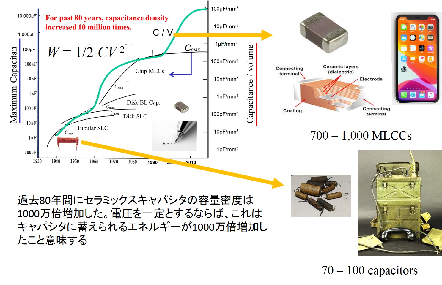 積層技術で作製するセラミックスキャパシタを積層セラミックスキャパシタ(Multi-Layered Ceramic Capacitor, MLCC)といいます。 積層技術ができる前のキャパシタは、図2にあるような戦争中の通信機などに使われていました。この時の1台の通信機に使われるキャパシタの数は70-100個程度でした。 これに対し現在のスマートフォンでは、小さなボディの中で700-1000個のMLCCが使われています。 2つの通信機の体積を比較し、使われているキャパシタの数を比較すれば、技術の進歩により体積容量密度が桁違いに高くなっていることがわかります。 体積容量密度とは単位体積あたりの静電容量Cです。 実際に体積容量密度の推移をみますと、80年間で何と1000万倍にもなっていることがわかります。 キャパシタに蓄えられるエネルギーはW=(1/2)CV2ですので、電圧が同じならば、体積容量密度の増加はエネルギー密度と等しくなります。 電源電圧の低下と体積密度から重量密度への変換を考慮しても、セラミックスキャパシタの重量エネルギー密度は80年間で100万倍程度増加しています。 これに対し、電池の場合は、1950年代に作られた乾電池と2020年に作られた乾電池のエネルギー密度はほとんど同じです。 電池のエネルギー密度は、化学反応が同じで電極活物質が同じならば技術が進歩しても上げることはできませんので、これは当然の結果です。 したがって、電池のエネルギー密度を上げるには、化学反応と活物質を変えるしかないのです。 | ||