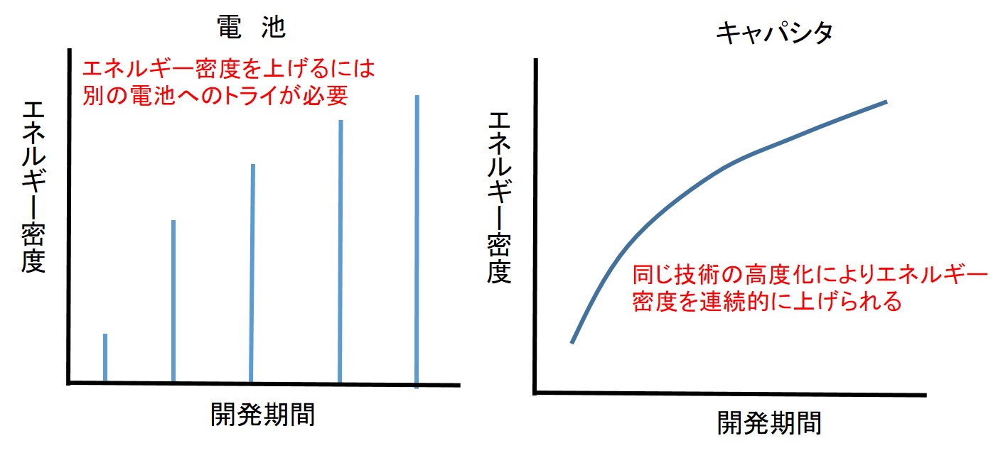 ![]() 図3 電池とキャパシタのエネルギー密度向上のための技術開発の違い | ||