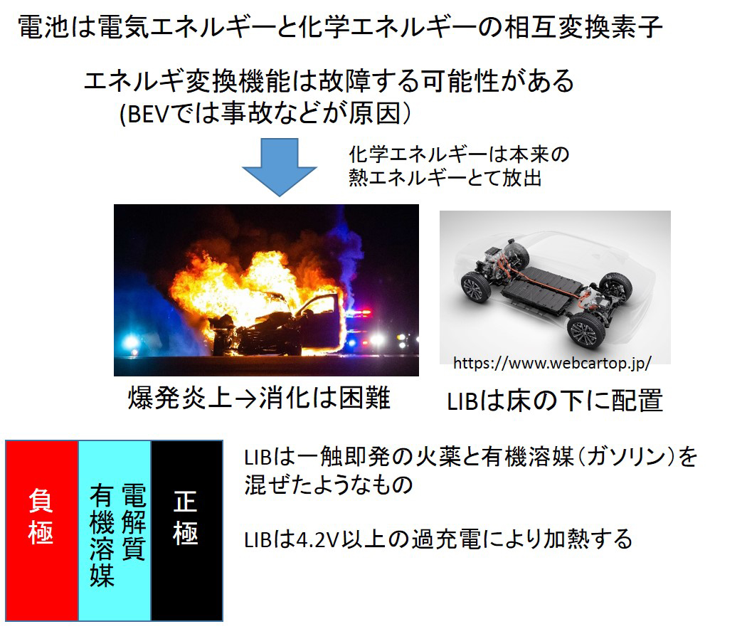 電池は電気エネルギーを化学エネルギーに変換して蓄えるので、衝突事故など何かの原因でエネルギー変換機能が故障すれば、化学エネルギーは本来の熱エネルギーとして放出されます。