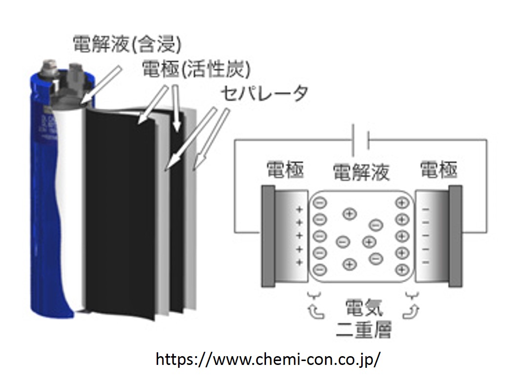電極の間に誘電体ではなく液体電解質を挟んだキャパシタで、ウルトラキャパシタやスーパーキャパシタとも呼ばれます。