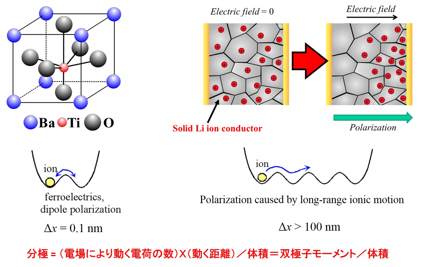 電場によりイオンの移動距離は単位格子内のイオン位置から最大でも0.1nmです。 これに対し、右側の固体電界質の場合は、100nmにもなります。この移動距離の差は両者の分極の差となりますので、固体電解質を用いた場合は、チタン酸バリウムを用いた場合よりも桁違いに高くなります。 このことは、固体電解質を用いることで巨大分極が得られることを示しています。 | ||