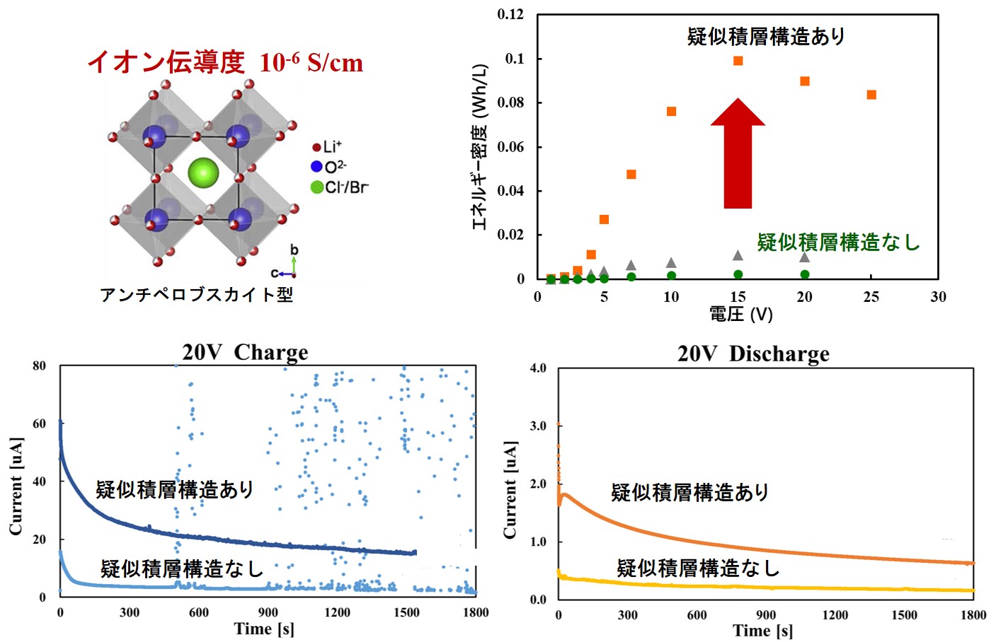 ナノ構造を導入していない試料では、充電時にパルス的な電流が流れ電気分解が起こっているのに対し、ナノ構造を入れた試料ではそれが抑えられています。 このことから固体電解質にナノ構造(疑似積層構造)を導入することで、電気二重層キャパシタを高電圧化したHV固体イオンキャパシタ(HV-SIC)が作れることが実験的に検証されました。 エネルギー密度についても高電圧での充放電が可能になったため、大幅に増加しました。 しかしながら、試料の厚みが500μmと厚いこととナノ構造の均一性が悪いために大きなエネルギー密度は得られていません。 | ||