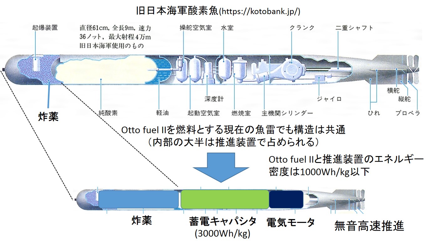 ![]() 図2 旧日本海軍酸素魚雷と高性能蓄電キャパシタを使う新型魚雷の構造 | ||